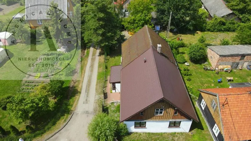 Dom mieszkalny murowany, parterowy z poddaszem nieużytkowym, kryty blachodachówką. Budynek mieszkalny o powierzchni całkowitej 142,20m2 a powierzchnia użytkowa to 87,20 m2 i składa się z 3 trzech pokoi, kuchni, łazienki, oddzielnego pomieszczenia wc, korytarza i dodatkowo wejście na ganek. Na części górnej mamy duży strych.